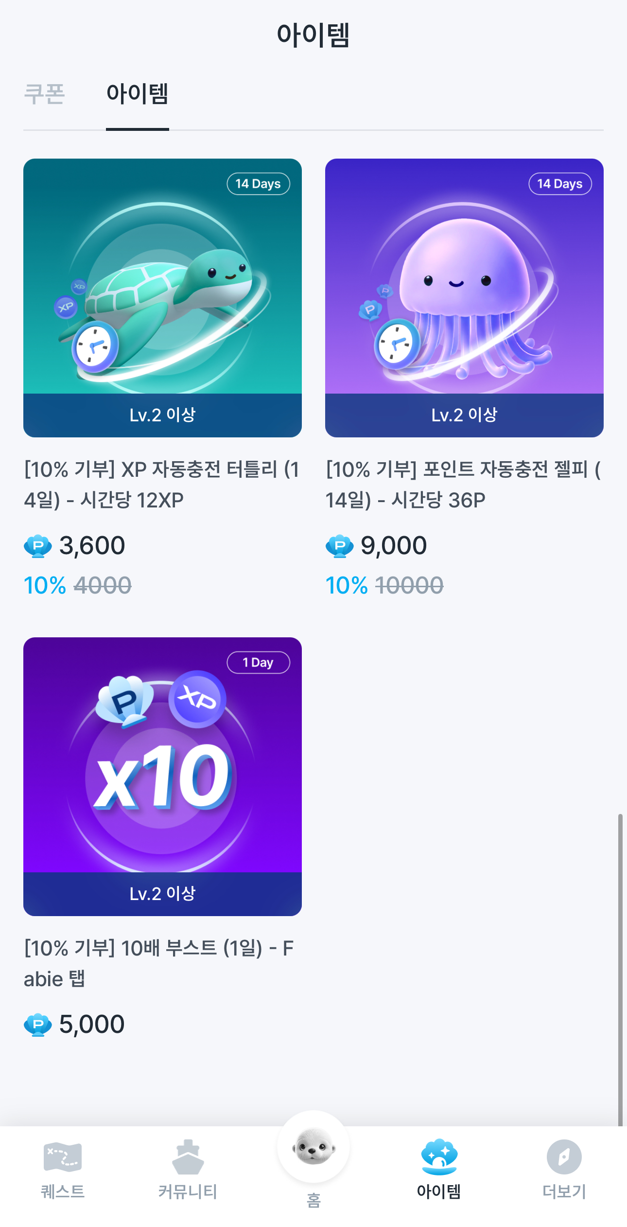그래서 기부도 하고 탭 몇 번은 하니까 부스터 아이템을 매일 구매하고 있어요!