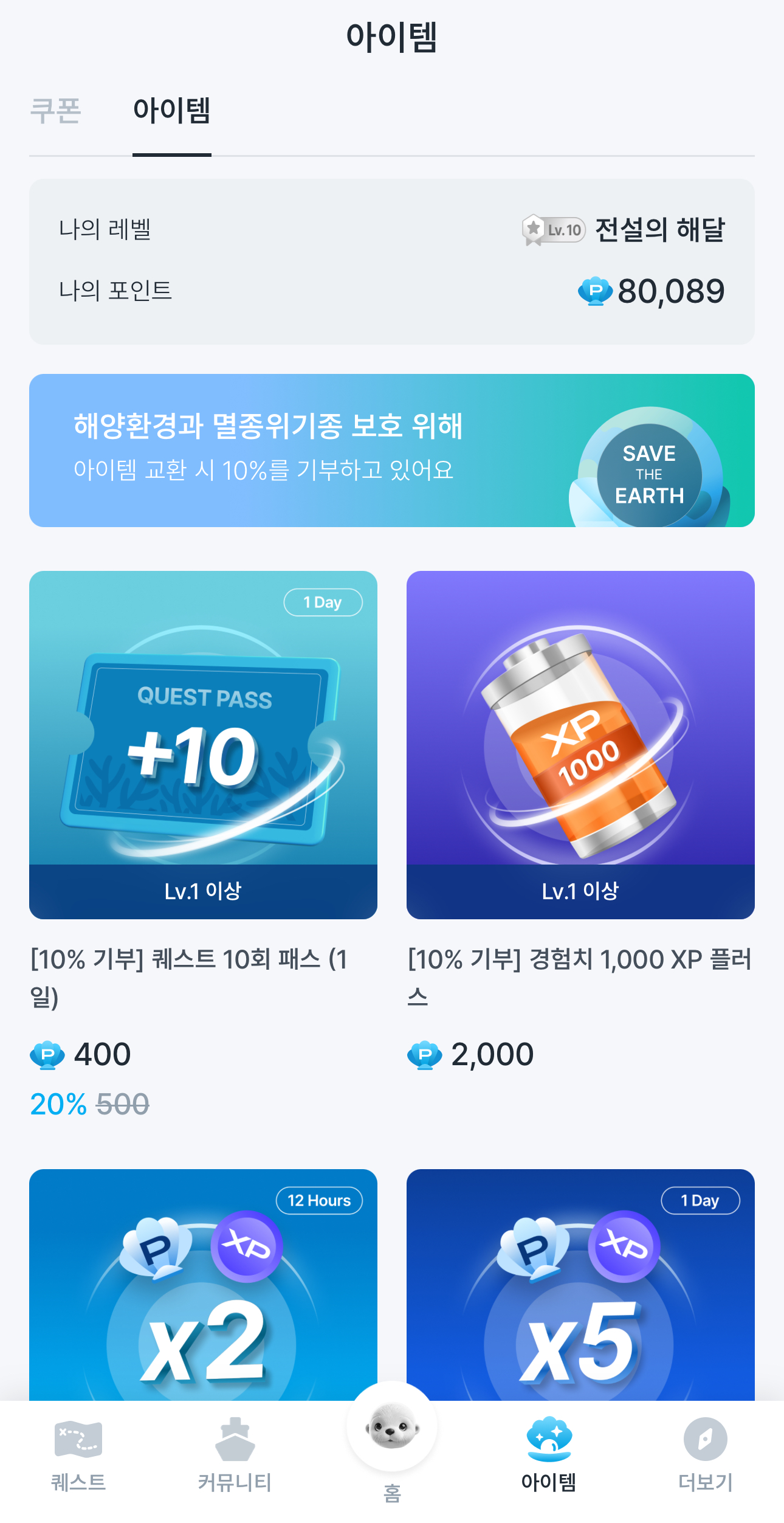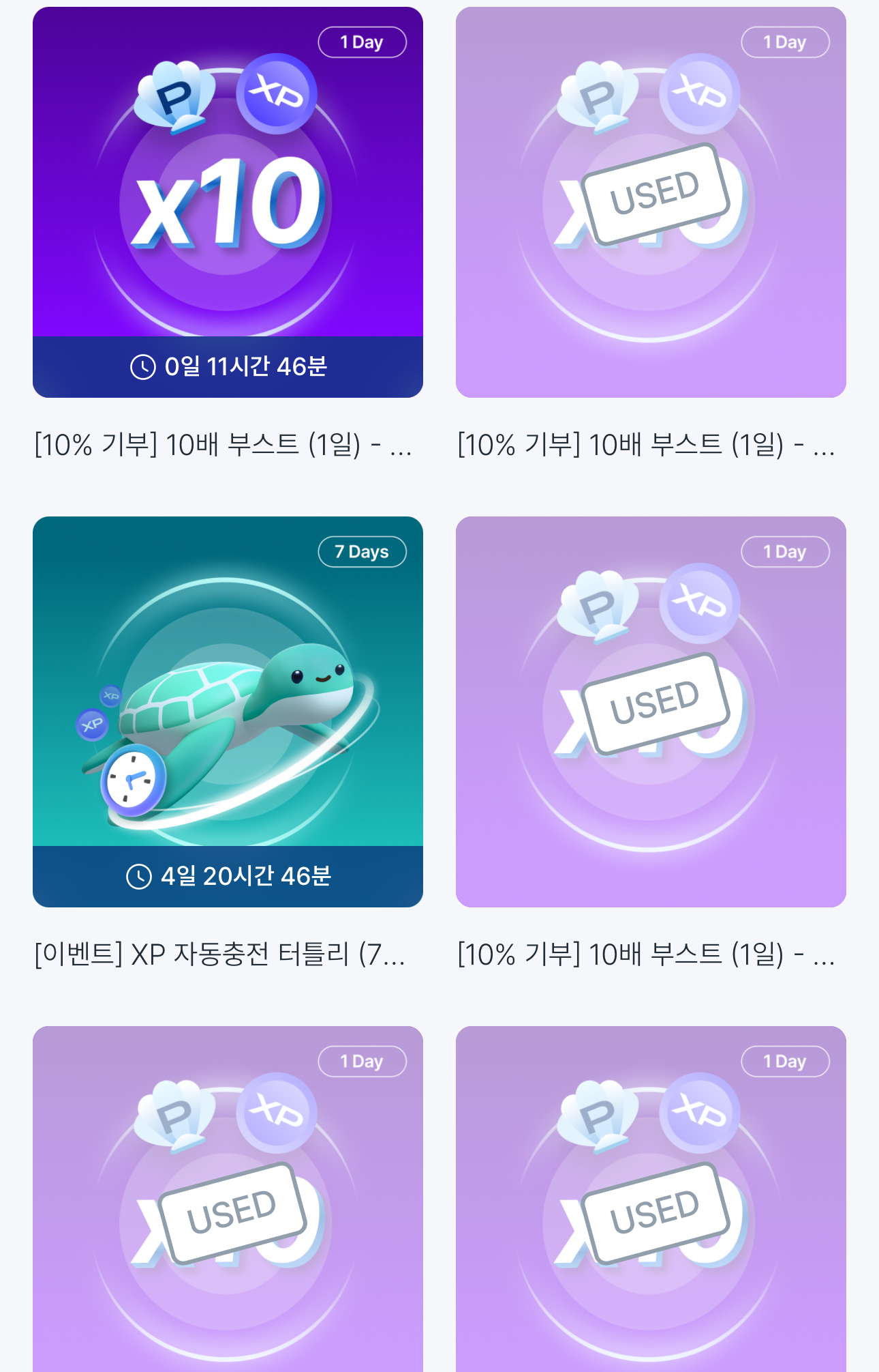 10X 부스터를 사용하면 0.01씩 쌓이던 포인트와 경험치가 0.1씩 쌓이는 걸로 바뀌어요.