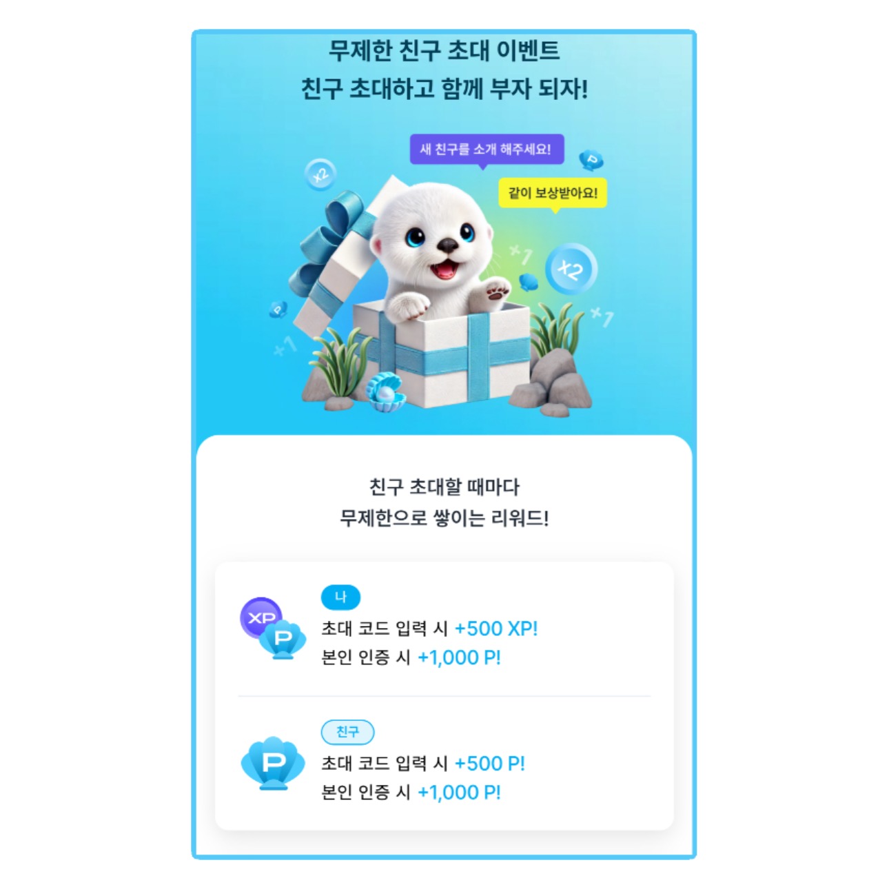 친구가 초대 코드 입력 시 500XP를 받을 수 있고,