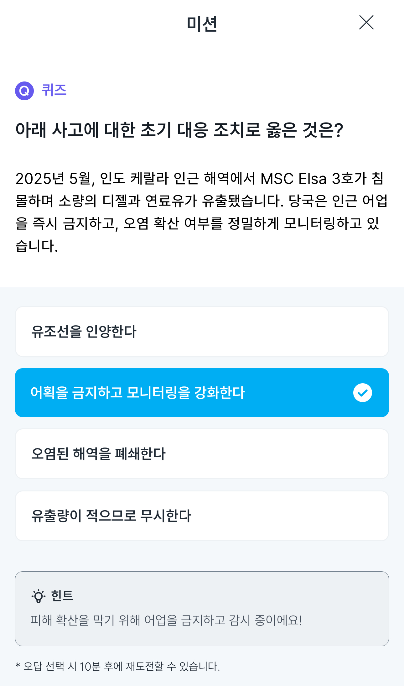 오답 선택 시 10분 후에 재도전이 가능해요!