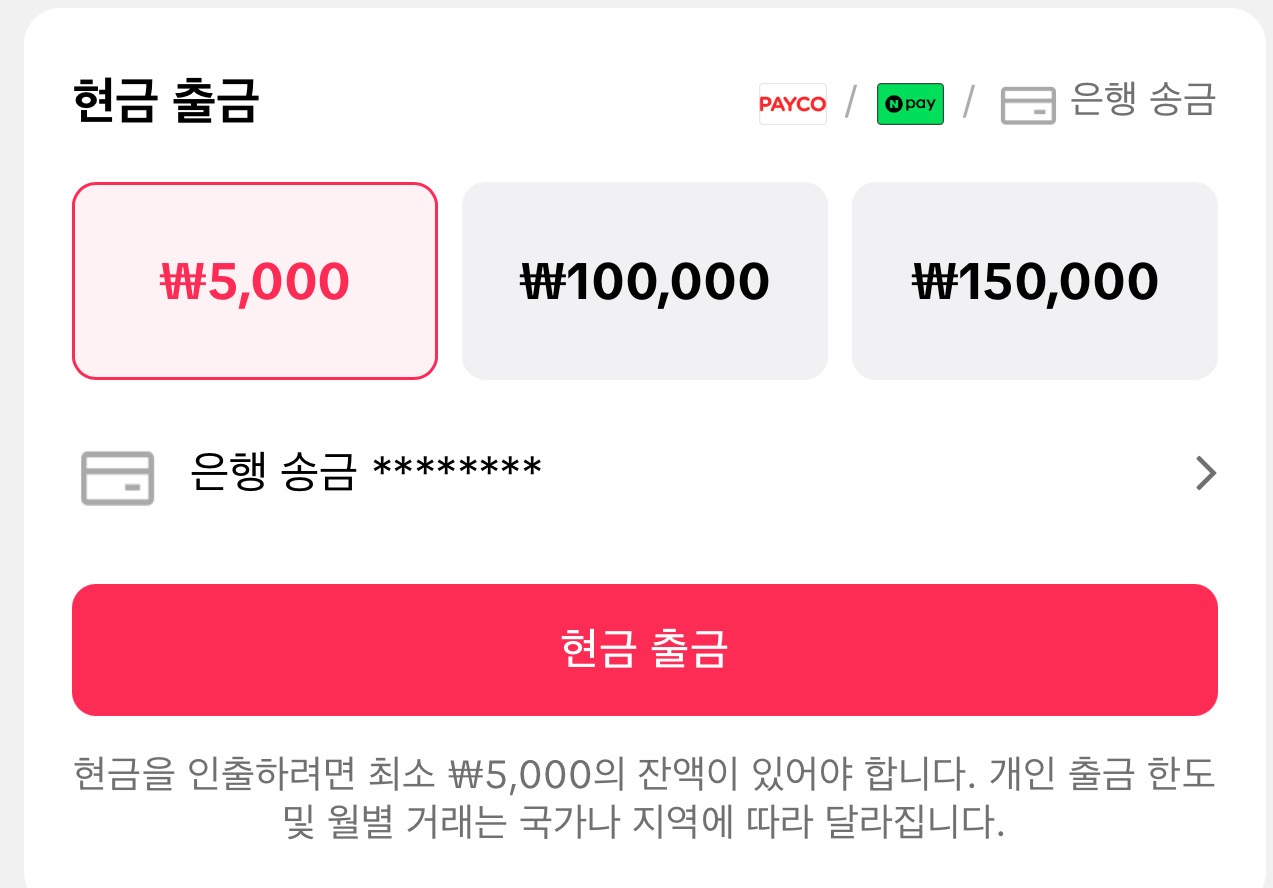 출금은 5천 원, 10만 원, 15만 원 이렇게 되고요!