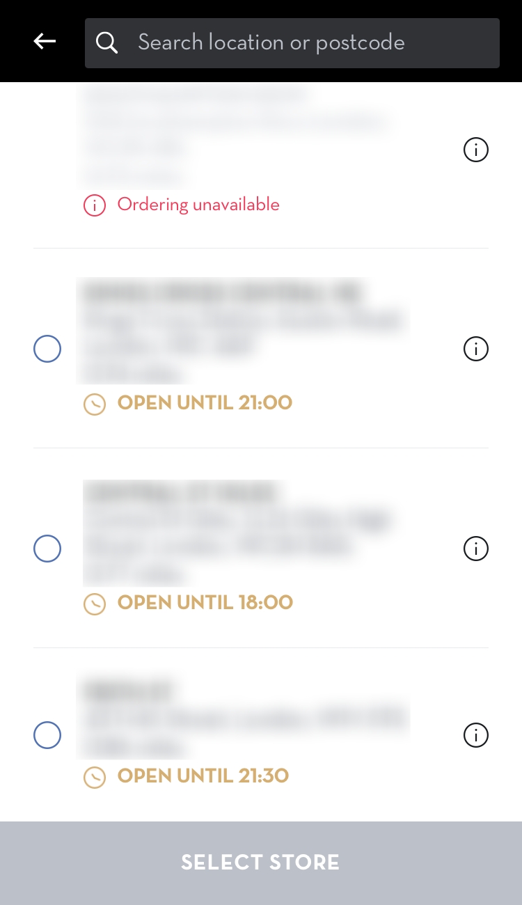 클릭 앤 콜렉트 주문에서 보이는 매장 선택 화면이에요!