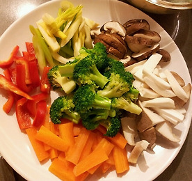 메뉴 : 브로콜리 볶음 재료 : 브로콜리 1 송이, 감자 1 개, 배추잎 2 장, 죽순 약간, 생표고버섯 3 개, 새송이버섯 1 개, 당근 1/4 개, 샐러리 1 대, 붉은피망 1개 양념 : 다싯물 2컵, 녹말믈 1큰술, 소금, 후추가루, 참기름, 식용유 2 큰술, 진간장 1큰술 [만들기] 재료준비 1. 브로콜리는 송이를 잘라 끓는 소금물에 파랑게 데친다. 2. 감자는 껍질을 벗겨 약간만 굵게 채썬 후 찬물에 담가 녹말을 제거한다. 3. 죽순은 사이사이에 끼어 있는 석회를 제거한 후 모양대로 얇게 썬다. 4. 생표고버섯은 기둥을 떼어내고 약간만 굵게 채썬다. 5. 새송이버섯은 4 등분하여 표고버섯과 비슷한 크기로 채썬다. 6. 붉은 피망은 반을 갈라 속씨를 떼어낸 후 길이로 채썬다. 7. 당근은 반으로 ..
