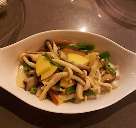 메뉴 : 버섯겨자냉채 재료 : 백일송이버섯 1팩, 새송이 버섯 4개, 표고버섯6개, 느타리버섯1줌, 사과1개, 소금 소스 : 연겨자 2큰술, 설탕 2큰술, 식초 2큰술, 소금 1작은술, 참기름 1작은술, 레몬즙 1작은술, 꿀 1작은술 [만들기] 백일송이버섯은 가닥으로 새송이버섯은 길이로 채썰어 대친다. 표고버섯 채썰어서, 느타리버섯 찢어서 데친다. 사과는 편으로 작게 썰어 연한 소금물에 담갔다 건진다. 피망은 가늘게 채썬다. 분량의 재료로 소스를 만들어 버섯과 야채의 물기를 완전하 제거하여 소스에 버무리면 맛나는 버섯겨자냉채 완성^^~**♬